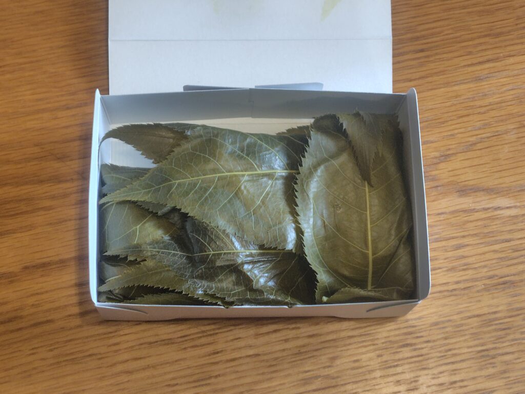 箱を開けた瞬間の驚き。これが桜餅?と思いました。葉っぱしか見えないんだもん。